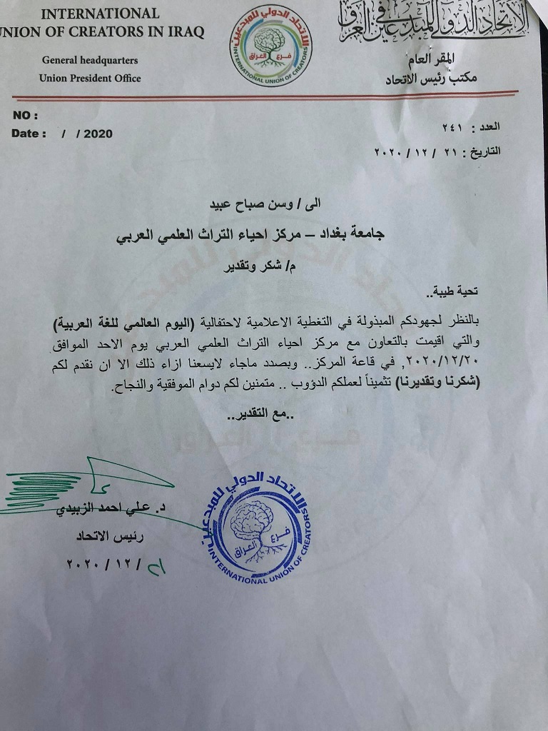 حصلت وحدة الاعلام والمعلوماتية متمثله بالسيد فارس عيسى فارس والسيدة وسن صباح عبيد من الاتحاد الدولي للمبدعين في العراق ، لجهودهم المبذولة فيتغطية احتفالية (( اليوم العالمي للغة العربية )) بتاريخ 20/12/2020 متمنين لهم دوام الموفقية والنجاح الدائم ….