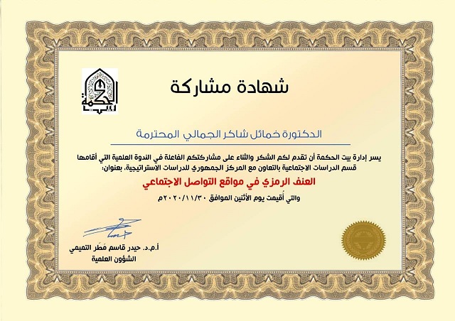 حصلت الدكتورة خمائل شاكر الجمالي رئيس قسم توثيق بغداد في مركز احياء التراث العلمي العربي / جامعة بغداد على شهادة مشاركة في الندوة العلمية التي اقامها بيت الحكمة قسم الدراسات الاجتماعية وبالتعاون مع قسم المركز الجمهوري للدراسات الاستيراتيجية يوم الاثنين الموافق 30/11/2020بعنوان ( العنف الرمزي في مواقع التواصل الاجتماعي ) بورقتها البحثية ( ظاهرة التنمر الإلكتروني عند المراهقين) .. متحدثة بان التنمر الإلكتروني هو استغلال الإنترنيت والتقنيات المتعلقة به بهدف إيذاء أشخاص آخرين بطريقة متكررة ومتعمدة ، ومن أثار التنمر الإلكتروني: فعند حدوث التنمر قد تشعر كما لو أنك عُرضة للهجوم في كل مكان ، حتى في منزلك ، قد يبدو الأمر بلا مفر. قد تستمر التأثيرات لأمدٍ طويل كما تؤثر على الشخص بعدة طرق : 1- يتسبب التنمر الإلكتروني في اكتئاب الشخص المتنمر عليه في حال لم يتلقى المساعدة الفورية2- قد يصل الشخص المتنمر عليه إلى مرحلة يظن أن إنهاء حياته هو السبيل الوحيد للخلاص من التنمر الإلكتروني حيث سُجلت الكثير من الحالات التي قام فيها أشخاص متنمر عليهم بالانتحار 3- صعوبة ثقة الضحية بالأخرين والنظر إليهم بعين الشك والخوف وافتقاد الشعور بالأمان 4- في كثير من الآحيان يلجأ الشخص الذي تعرض للتنمر إلى الانعزال خصوصاً صغار السن والمراهقين . 5- تشتت الذهن وتدني المستوى الدراسي للضحية في حال كان طاباً في المدرسة أو الجامعة 6- الشعور بالخوف والقلق والترقب لكل شيء جديد ومزعج 7- تؤدي إلى مشاكل صحية وتأثيرات سلبية قد يؤدي إلى أمتناع الأشخاص عن التحدث . 8-التعرض للعديد من الأمراض الجسدية والنفسية 9- الإصابة باضطراب في الأكل والنوم …