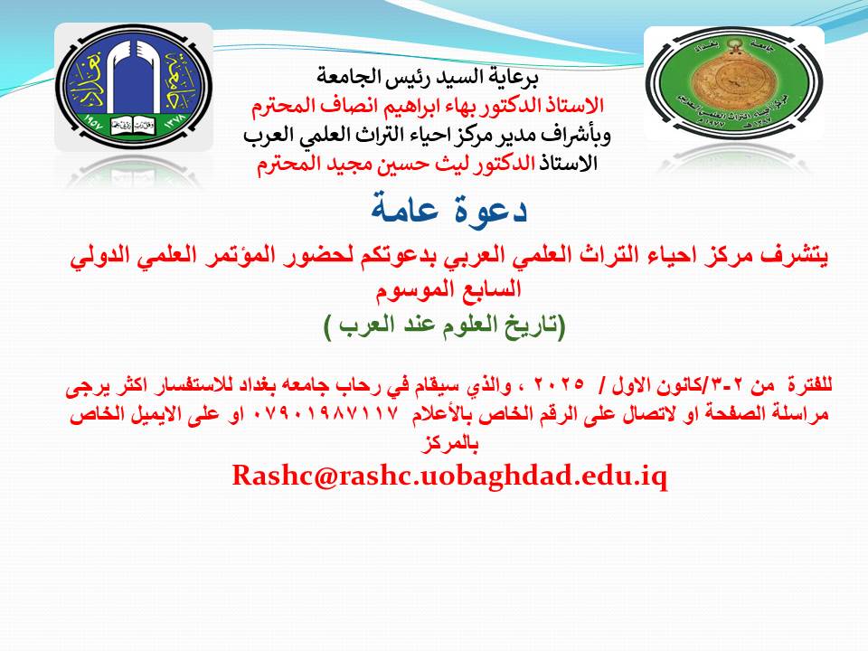 بأشراف من قبل الاستاذ الدكتور ليث مجيد حسين مدير مركز احياء التراث العلمي العربي في جامعة بغداد يقيم مركزنا مؤتمره العلمي الدولي السابع الموسوم ( تاريخ العلوم عند العرب ) الموافق اليوم الثاني والثالث من شهر كانون الاول لعام٢٠٢٥ وعلى قاعة مركز التخطيط الحضري والاقليمي للدراسات العليا / فعلى الراغبين بالمشاركة في المؤتمر الاتصال على الارقام والايميل الموجودة في الفولدر.